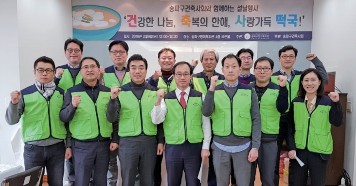 송파구지역건축사회가 2월 9일 송파구방이복지관에서 진행되는 떡국행사에 후원, 참여했다고 밝혔다. 이번 행사는 ‘건강한 나눔, 축복의 한해, 사랑가득 떡국(건.축.사 떡국)’을 타이틀로 지역사회 장애인들에게 따뜻한 사랑을 전하고 나눔을 실천하기 위해 개최됐다.