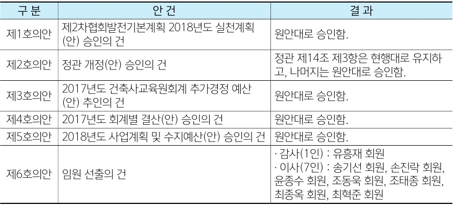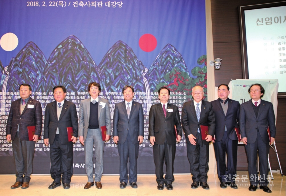 사협은 2월 22일 서울 서초동 건축사회관에서 제52회 정기총회를 열고 ▶ 제2차 협회발전기본계획 2018년도 실천계획(안) 승인의 건 ▶ 정관 개정(안) 승인의 건 ▶ 2017년도 건축사교육원회계 추가경정 예산(안) 추인의 건 ▶ 2017년도 회계별 결산(안) 승인의 건 ▶ 2018년도 사업계획 및 수지예산(안) 승인의 건 ▶ 임원 선출의 건을 의결했다. 신임감사에는 유흥재 건축사(부운 건축사사무소)가 선출됐다. 또 신임이사로는 손진락(주.화성 건축사사무소)·송기선(종합건축사사무소 지오그룹)·윤종수(아리 건축사사무소)·조동욱(아키그룹성창 건축사사무소)·조태종(주.마당 종합건축사사무소)·최종옥(건축사사무소 세인)·최혁준(건축사사무소 이데아21) 건축사가 선출됐다.
