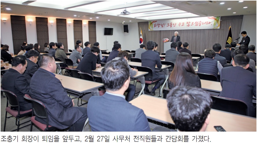 대한건축사협회(이하 사협) 조충기 회장이 퇴임 및 인수인계를 앞두고, 2월 27일 건축사회관 국제회의실에서 사무처 전직원들과 간담회를 가졌다. 조 회장은 “3년간의 임기동안 협회가 건축정보센터, 연구원 등 긍정적인 효과를 거둘 수 있도록 힘써준 사무처 직원들에게 고맙다”며 “사람들이 많이 찾는 살찌는 협회가 되길 바란다”고 격려 인사를 전했다. 한편, 회장 및 임원 이·취임식은 3월 5일(월) 오후 4시 서울 서초동 건축사회관 1층 대강당에서 개최된다.