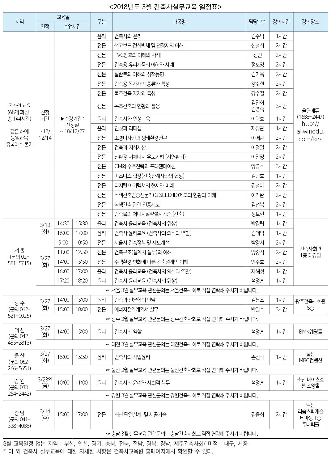 3월 건축사실무교육 일정이 공고됐다. 수강신청은 해당 과목 교육일 2~3주 전부터 가능하며,자세한 사항은 건축사교육원 홈페이지(http://www.kiraaeb.or.kr)와 해당 시도건축사회에서 확인할 수 있다. 건축사실무교육 사이버교육은 '올윈에듀(http://allwinedu.com/kira)'에서 신청, 수강할 수 있다. 실무교육 이수시간 인정기준은 5년간 총 40시간(윤리 5시간, 전문 25시간 이상, 자기계발 10시간 이하)이다.