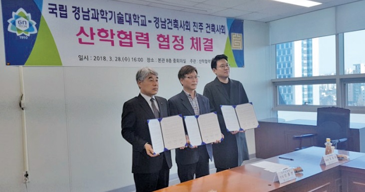 진주지역건축사회와 국립 경남과학기술대학교가 산학협력을 체결했다. 협약식은 3월 28일 경남과기대 본관 중회의실에서 관계 직원들이 참석한 가운데 진행됐다. 협약을 통해 학생 맞춤형 교육, 인적·물적 교류, 지역사회 발전을 위한 협력을 결의했다.