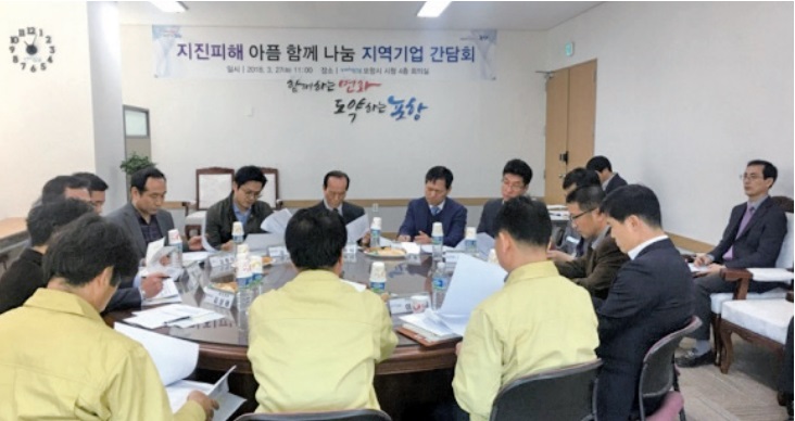 3월 27일 포항지역건축사회는 포항시가 개최한 간담회에 참석했다고 전했다. 간담회는 2017년 11.15 지진으로 피해를 입은 지역주민들에게 주택복구 지원을 위해 개최된 것으로, 포스코, 현대제철, 동국제강 등 지역 공기업체와 삼도주택 등 지역주택업체 등이 참석했다.