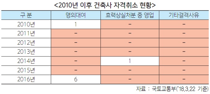 하지만 단속과 관련해서는 주무부처인 국토교통부와 단속 실무를 담당하는 지자체들은 사실상 손을 놓고 있는 상황이다. 3월 20일 건축사등록원에 따르면 불법 명의대여 사유로 건축사 자격이 취소된 경우는 최근 8년간 7건에 불과했다.