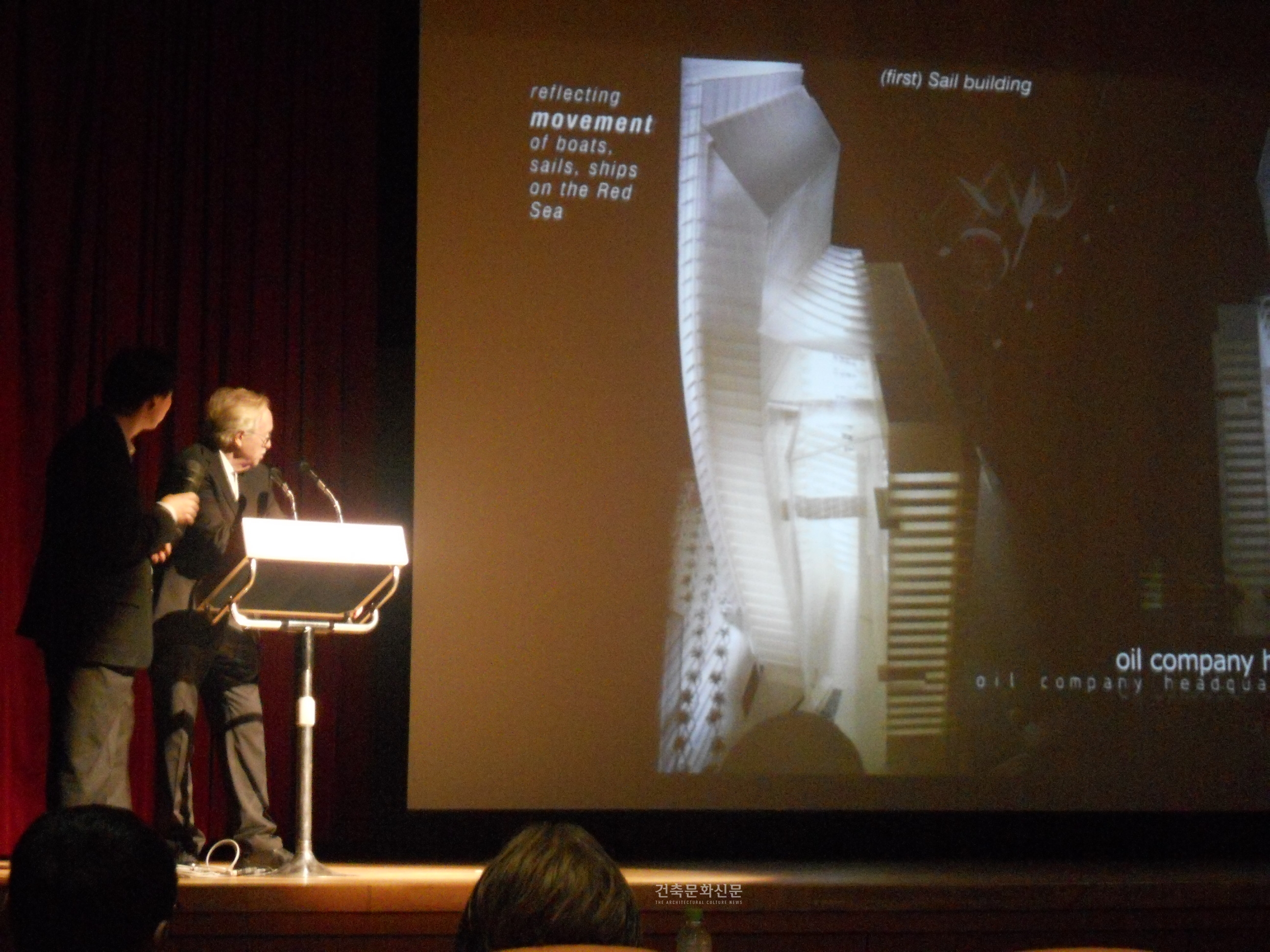 이날 강연은 그동안 그가 작업해 온 중요 프로젝트를 자료를 통해 설명하는 방식으로 진행되었는데 그의 출세작이라 할 수 있는 스키비스트신문사,1998/ 베포공항현상설계안,1989/ 릭스병원,1990/ 세일빌딩,1992/ 디로이트&토우크본부,1991/ 뉴욕피치아트릭학회,1998/ 서울돔,1998/ 북경중심블록단지계획,2001/ WorldTradeCenter현상설계안,2001/ 라스베가스공항터미널계획,2001/ Telenor Headquarters,2003/ IT Samsung/ EtonCenter/ Towers/ The Sail/ Akerselva Atrium Oslo, Norway 그리고 아직 당선작이 발표되지 않은 Valerenga Stadium 현상설계안 등의 작품을 보여주었다. 특히 그 가운데서도 Telenor Headquarters/ The Sail/ Akerselva Atrium 의 세 작품을 스스로 만족스런 역작으로 꼽는 듯 많은 장면을 할애하며 자세히 설명하였다. 그리고 “현재 설계를 하는데 있어서는 Sustainable 개념을 갖지 않고는 할 수 없다.“ 고 강조했다.