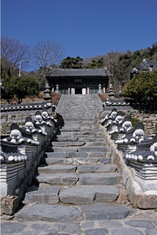 계단식 3단의 축대를 쌓아 원래의 위치에서 가장 높은 곳으로 옮겨온 대웅전을 바라보며 한 계단, 한 계단 올라가다보면 선한 마음으로 참선의 의미를 찾게 해 줍니다.