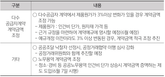 또한, 기재부는 제도개선을 위해 계약예규 개정과 필요한 세부규정을 6월까지 마련할 계획이며, 납품단가 조정이 민간 하도급 시장에도 퍼질 수 있도록 공공조달 낙찰자 선정 시 공정거래협약 이행 심사를 강화하는 방안 등을 공정거래위원회와 추진한다고 전했다.