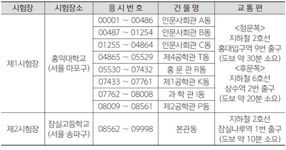 국토교통부와 대한건축사협회는 4월 25일 2018년도 건축사 예비시험의 장소를 공고했다고 밝혔다. 시험장소는 서울 마포구 소재의 ▲ 홍익대학교(제1시험장)와 서울 송파구 소재의 ▲ 잠실고등학교(제2시험장)이다. 응시번호 00001부터 08561까지는 홍익대학교에서 응시번호 08562부터 09998번은 잠실고등학교에서 시험을 보게 된다.