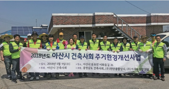 아산지역건축사회는 5월 8일, 9일 양일간 둔포면의 취약계층 거주지에 물품을 지원해주는 등 주거환경개선사업을 실시했다고 밝혔다. 아산지역건축사회 10년째 주거개선사업을 진행중이며, 청소년 취약계층 대상자에 집에 직접 방문하여 집수리 봉사를 진행하기도 했다.