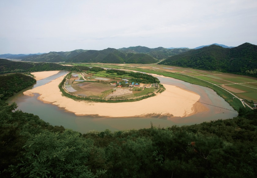 경북 예천 비룡산에 오르니 후텁지근했지만 넓은 백사장과 송림이 있는 섬마을이 한눈에 들어와 가슴 속이 탁 트인다. 육지 속 섬마을 회룡포는 낙동강 지류인 내성천이 태극 모양으로 휘감아 모래사장을 만들어 땅의 모양이 예사롭지 않다. 초록빛 숲과 강물로 둘러싸인 마을 풍경은 자식을 보듬고 있는 어머니의 자궁 같다. 무풍지대의 쉼터 같다. 안온하다.
