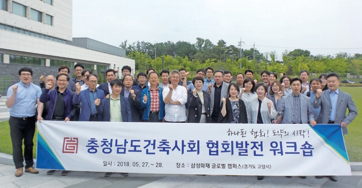 충청남도건축사회는 5월 27일부터 28일까지 양일간 경기도 고양시에 위치한 삼성화재 글로벌 캠퍼스에서 2018 협회발전 임원워크샵을 진행했다고 밝혔다. 워크샵에는 충청남도건축사회 임원과 사무처 직원 총 42명이 참석했으며, 천안박물관 답사, 최신단열설계 세미나 등이 함께 진행됐다.