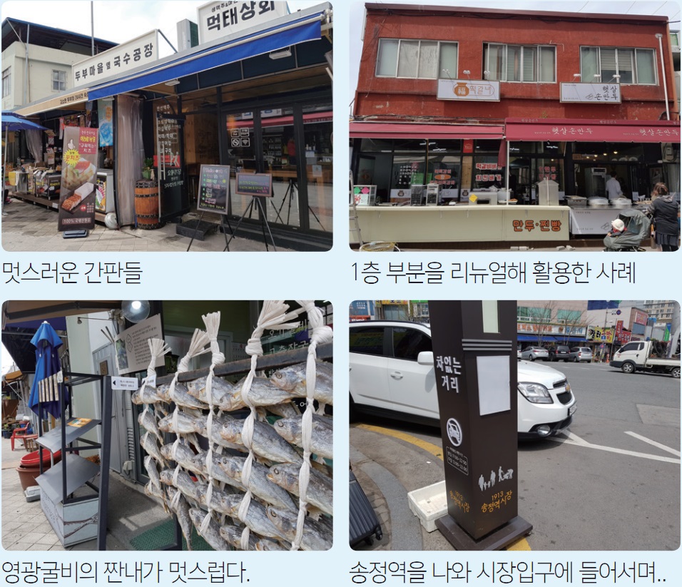 송정역을 나와 횡단보도를 건너 작은 골목으로 들어서면 또 다른 스토리가 있는 곳이 보인다. 기존 역전주변에서 느끼던 것과는 다른 옛 추억이 있지만 깨끗하고, 옛 먹을거리가 있지만 내 입맛에 맞는 먹거리가 있다.