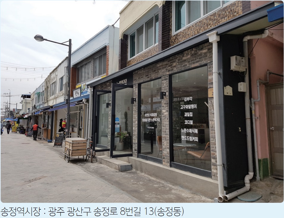 광주송정역이 들어서면서 기존상권은 보존되고 새로운 청년 집단과 시장 현대화작업으로 현재는 많은 내방객이 찾아오는 시설로 변모됐다. 옛 정취를 느끼면서 시장의 구석구석을 돌아볼 수 있는 색다름을 준다. 먹거리의 향내와 작은 볼거리의 옛것들... 혹은 송정을 알리는 작은 이야기까지 볼 수 있다.