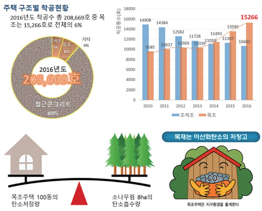 우리나라는 전체 주택 약 20만 호의 6%정도가 목조주택이며, 2016년 현재 연간 15,266동의 목조건축이 착공되었다. 주택 1동에 평균 24㎥의 목재를 사용하고 있으므로 저장되는 탄소량은 1동당 6톤(탄소)이다. 이를 연간 축조되는 건물로 환산하면 목조주택 만으로 9만 탄소 톤-CO2 이상이 저장된다.