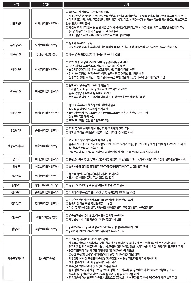 6·13 제7회 전국동시지방선거 결과 전국 17개 광역단체 중 여당인 더불어민주당이 대구·경북·제주를 제외한 14개 단체장 자리를 차지한 가운데 당선인들이 내놓은 건축 관련 공약에도 관심이 쏠리고 있다. 민주당은 226곳의 기초단체장 중에서는 151곳을 가져갔다.