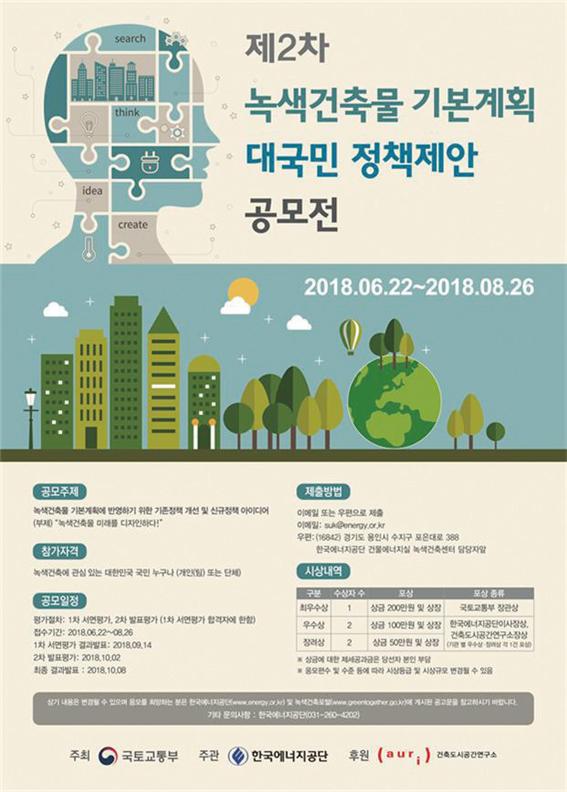 ‘녹색건축물 미래를 디자인하다’란 주제 아래, ‘녹색건축물 기본계획에 반영하기 위한 기존 정책 개선 및 신규 정책 아이디어’를 모집한다.