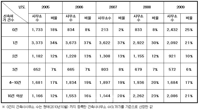 대한건축사협회 전영철 상근이사가 발표한 이 보고서에 따르면, 2009년 기준으로 단 한건의 업무수주도 못한 사무소수가 전체 25%인 2,432개소이며, 한건을 수주한 사무소가 21%인2,029개소로서 거의 절반이 46%가 휴업상태를 면치 못하고 있는 것으로 들어났다. 또한, 3건 이하가 61%에 달하고 있다. 이에 비하여 매출순위 50위권의 건축사사무소가 국내 건축설계시장 총 매출의 약 35%를 차지하고 있으며 신축허가면적은 하위 8천여개 건축사사무소의 면적보다 더 많은 것으로 알려져, 건축계의 ‘부익부 빈익빈 현상’이 심각한 것으로 드러났다. 특히 금번 발표한 자료는 국토해양부의 세움터에서 취득한 것으로 대한건축사협회 비회원까지 전 개업 건축사를 대상으로 한 것으로서 그 신뢰도과 완전하다는 접에서 충격을 주고 있다.