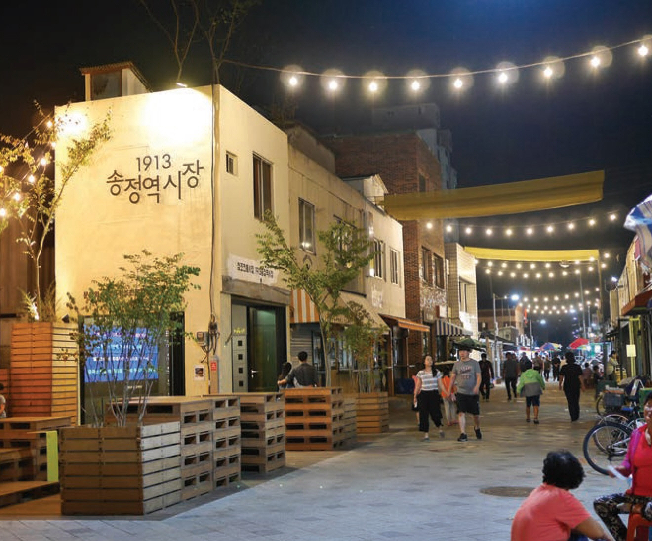 ◇100년이 넘는 시장 역사에 주목해 ‘지키기 위한 변화’를 비전으로 각 점포마다의 ‘이야기’를 발굴해 이를 점포 디자인과 리모델링 콘텐츠로 활용했다. 간판, 파사드, 인테리어 등에 그 점포의 역사가 나타나 있다. 또 곳곳에 송정역시장의 역사를 넣어 방문객이 자연스럽게 시장의 역사를 알아볼 수 있도록 했다. 한편 물건을 사고 파는 시장의 기능은 대형 마트와 비교해 경쟁력이 부족하다고 보고, ‘먹거리’ 중심으로 시장을 재구성했다. 2016년 4월, ‘1913송정역시장’으로 재개장한 이후 7월까지 네 달 동안 약 15만 명의 방문객이 시장을 다녀갔다. 광주광산구-건물주-시장 상인들은 과도한 임대료 폭등이 막 활성화되는 시장에 부정적 영향을 미칠 수 있다는 데 공감하고, 임대료 상승을 막기 위한 자율 협약을 체결했다. 이 협약에 따라 건물주는 5년간 월세를 최대 9% 이상 인상하지 못하도록 한 ‘상가건물 임대차보호법’을 준수하기로 하고, 계약기간이 끝나고 상인들이 재계약을 희망하면 특별한 사정이 없는 한 적극 협력하는 데 동의했다.