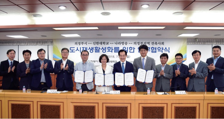 의정부시, 의정부지역건축사회, 신한대학교, CJ헬로나라방송이 7월 16일 업무협약을 맺었다. 협약은 각 기관이 의정부 도시재생을 위한 자문, 연구, 교육 등 제반적인 사항에 대하여 상호 협력하고, 의정부시 구도심 쇠퇴지역의 활성화를 위하여 함께 노력한다는 내용을 담고있다.