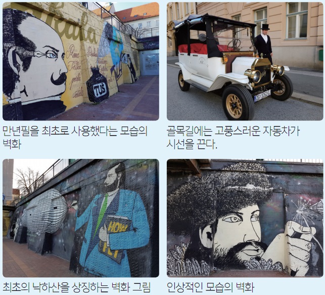 구시가지에는 다양한 벽화들이 있다. 그 중에 눈을 끄는 벽화가 있는데 구시가지가 내려다보이는 언덕에서 반 옐라치치 광장으로 내려가는 계단 하부에 그려져 있다. 독특하게도 전부 만년필을 쥐고 있는 모습이다. 크로아티아가 만년필이 최초로 나온 나라이기 때문이다. 또한 하늘을 나는 듯한 모습의 낙하산도 크로아티아에서 시작되었다고 한다.
