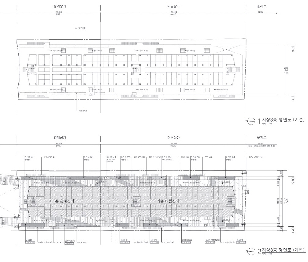 하지만, 지금의 풍경도 얼마 후면 조금은 바뀔 예정이다. 세운상가의 양쪽 주변일대 일부구역의 재개발이 확정되어 분지 같은 풍경이 빌딩 숲의 풍경으로 대체된다. 유럽의 도시경관이 매력적인 이유 중 하나는 성당, 궁궐, 타워 등 기념비적인 건축이 일정한 높이의 주변 주거, 상업 건물 군과 확연히 대조된다는 점이다. 기념비 건축은 일종의 랜드마크로서 도시전체에서 바라볼 수 있고 도시전체를 바라볼 수 있는데, 우리의 도시건축은 저마다 랜드마크가 되고자 올라가려 하니 결국 어떤 건물도 랜드마크가 되지 못하는 격이 아닐까 싶다. 낙후된 저밀도의 도시조직을 중밀도, 고밀도로 치환하면서도 골목공간이 주는 인간적 척도의 매력과 수평적 랜드마크로서의 세운상가라는 도시적 특징을 유지할 수는 없을까 생각해보게 된다.