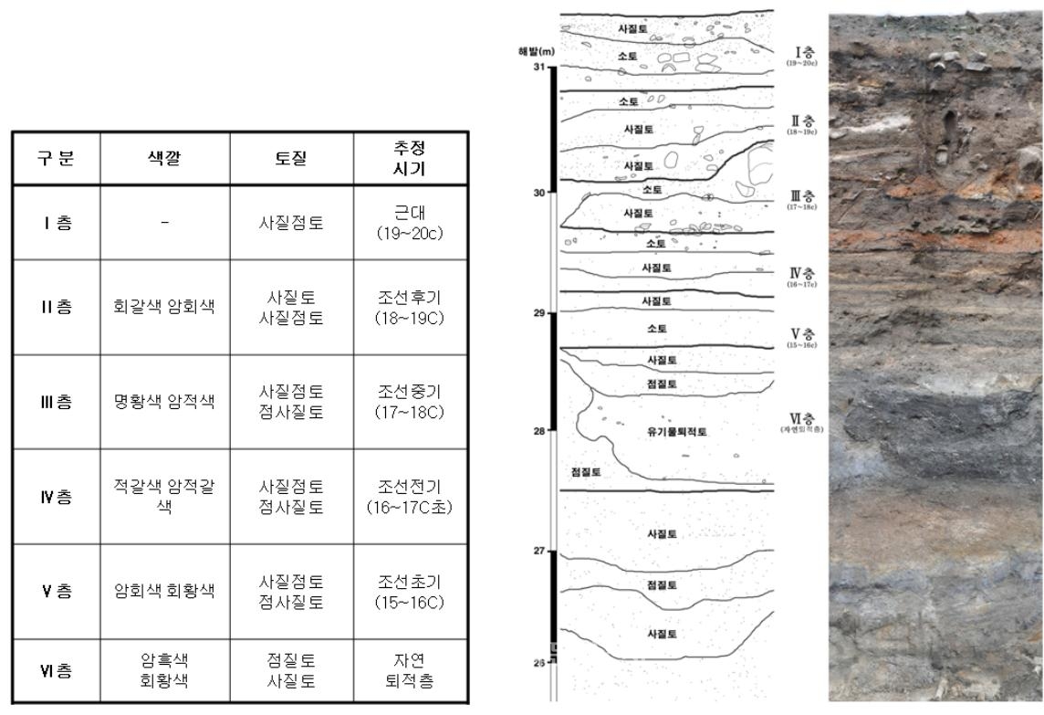 600년전 서울 종로는 지금 도로 면보다 깊으면 4∼6m 정도 묻혀 있다. 원래는 도성 중심이 모두 늪지였는데 조선조가 들어서면서 개천(청계천)을 만들고 부지를 건조시킨 다음, 나무말뚝을 박고 지정을 해서 대지를 조성했다. 대체로 100년이 지나면 1∼2자 정도가 올라오는데, 임진란이 되면 서울 전체가 불에 타고 초토화된다. 아마도 이때는 피난 갈 대책조차 없이 우왕좌왕 했던 듯 여기에서 많은 유물이 수습된다. 마루 밑창에 밀어 넣어놓고 간 것이다. 임진란이 끝나도 한동안은 인적이 한산하다가 숙종 년간에 이르면 서울이 다시 붐비게 된다. 이후 청계천이 자주 범람하여 청계천을 준설한 모래를 집안에 끌어들여 입사지정을 하면서 지반을 높여 나간다. 이후로는 빠른 속도로 지반을 높이고 집을 올려 가는데 고종 이후 20세기에는 1m씩 올라간다. 이것을 문화층이라고 하는데 지반의 단면을 깨끗하게 잘라 보면 지질이 전혀 다른 지층들을 발견할 수 있다.