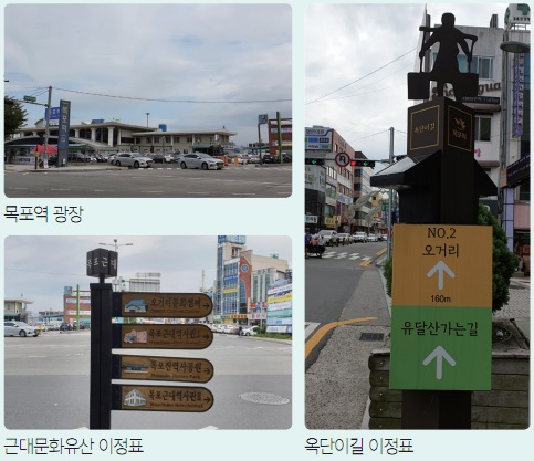 그 앞을 지나는 횡단보도에는 옥단이길 이정표가 있다. 어깨 지게에 메단 수통 두 개, 유달산 가는 길과 옥단이길, 근대문화유산 이정표이다. 이 이정표만 따라가면 된다.