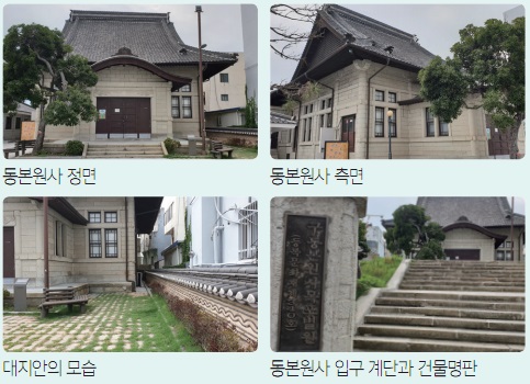 주변의 식당과 소매점 등이 함께 어울려 있고, 주차 공간이 부족하여 차량이 보차혼용도로에 가득하여 동본원사와 조화롭기 보다는 불협화음처럼 느껴져 조금 아쉬웠다. 건물은 일본식 기와를 얹어 웅장한 느낌을 주며, 석재벽면과 조화를 이루는 색감이 하늘의 색과 어울려서 보기 좋았다. 건물 내의 노목 또한 운치를 더 한다