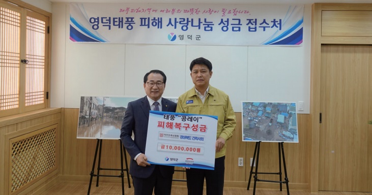 경상북도건축사회는 10월 22일 영덕군청을 방문하여 10월 7일 발생한 태풍(제25호) 콩레이로 건축물 피해를 입은 영덕군민을 위해 써달라며 피해복구성금 1천만원을 전달했다. 경상북도건축사회 방재원 회장은 “수재로 고통받고 있는 영덕 군민들에게 위로의 말씀을 전하고 싶다”고 전했다.