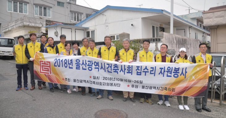 울산광역시건축사회는 10월 16일부터 25일까지 울산 남구 야음동 소재의 저소득층 2가구를 대상으로 ’사랑의 집수리 봉사‘를 실시했다고 말했다. 울산광역시건축사회 자원봉사단은 2016년 발대식을 가지고 건축사 자원봉사 활성화와 지역복지 발전 및 사회에 공헌하고자 지속적인 봉사를 펼쳐오고 있다.