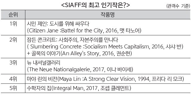 맷 타노어 감독의 ‘시민제인 : 도시를 위해 싸우다(이하 시민제인)’이 사전예매 순위 1위를 차지하며 SIAFF 2018의 인기영화 1위를 차지했다. 개막작 ‘시민제인’은 20세기 도시계획사에 혁명을 일으킨 저널리스트이자 사회운동가인 제인 제이콥스의 활동과 사상을 소개하는 다큐멘터리 영화로 제인 제이콥스는 로버트 모제의 독불장군식 뉴욕 개발에 대한 반대운동을 펼친 것으로 유명하다.