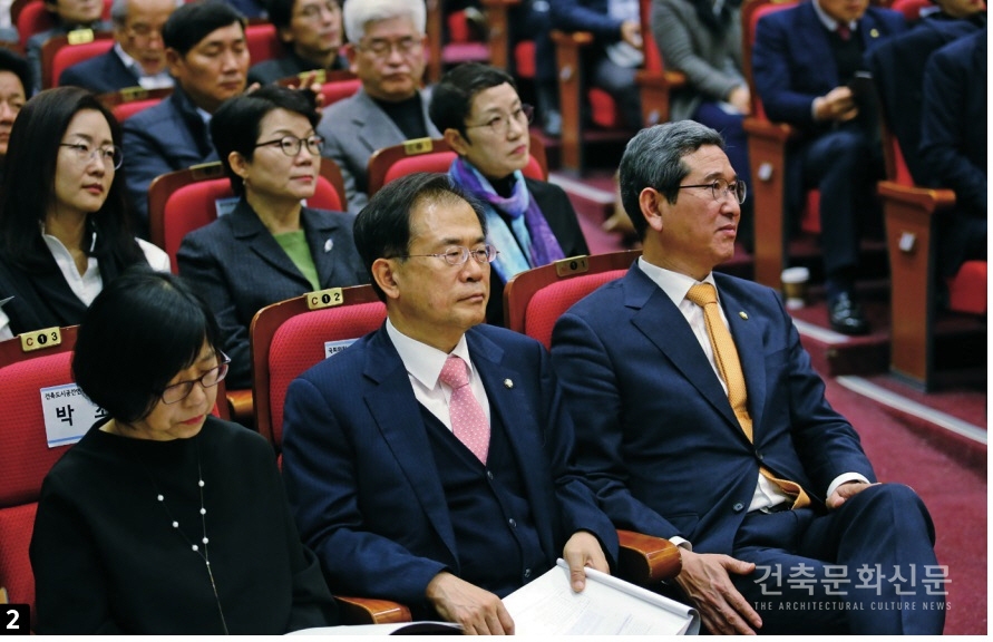 한편 이날 토론회에는 박순자 국회 국토교통위원장, 정동영 의원, 윤관석 의원, 김정호 의원, 송석준 의원, 윤영일 의원, 정갑윤 의원, 김학용 의원, 이명수 의원, 김영우 의원, 나경원 의원, 홍철호 의원 등 국회의원과 강철희 한국건축가협회 회장, 박인수 새건축사협의회 부회장, 이현수 대한건축학회 회장 등 건축계 인사들도 참석했다.