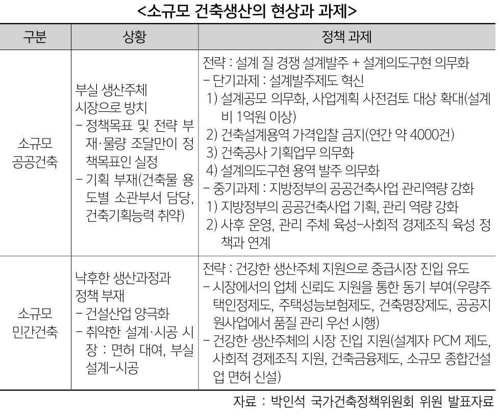 소규모 동네건축은 국민의 삶의 질에 있어서나 산업비중 측면에 있어 매우 중요한 정책 대상이다. 그러나 동네건축에 대한 통계는 없는 상황이다. 우리 사회가 여태까지 동네건축을 정책 대상으로 보지 않았다는 것이다. 중요한 소규모 건축산업이 방치되어 있다. 덤핑이 이뤄지는 시장 속에서 건강한 설계 주체나 견실한 시공주체가 정상적인 시장 활동을 하는데 방해받고 있다. 총체적인 부실상태라고 해도 과언이 아닌 이 상황 속에서 개선동력을 어디서 찾아야 할까? 공공부문과 민간부문으로 나눠 정책 전략을 달리 접근해야 한다고 생각한다.