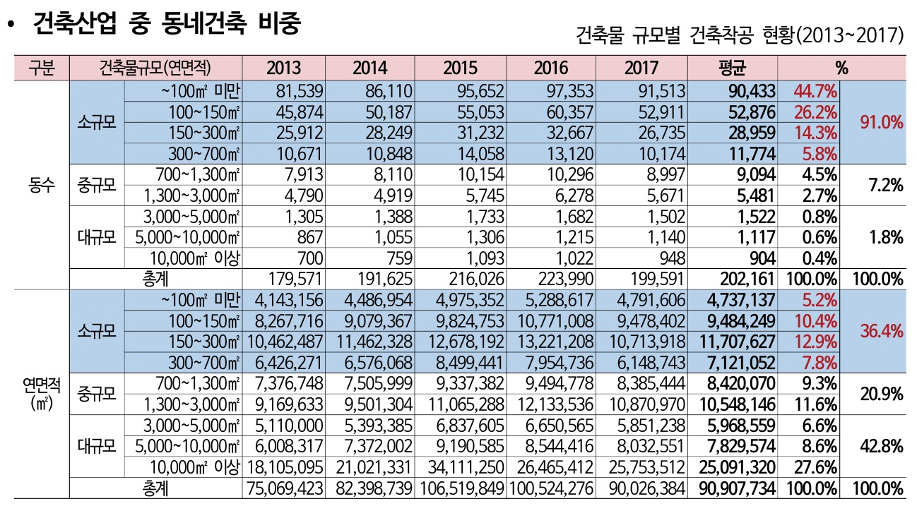 통계청의 2017년 통계에 의하면 우리나라 국토 전체를 덮고 있는 건축물은 712만동 정도 된다. 그 중 연면적이 1,000제곱미터 이하의 소규모 건축물이 666만 채로, 93%를 차지한다. 흔히 우리나라를 ‘아파트 공화국’이라고 하는데, 아파트를 동수로 추산하면 12만 5천동 정도이다. 불과 1.8%에 지나지 않는다. 우리가 동네건축이라 부르는 소규모건축물이 우리나라 건축물의 대부분이다. 그래서 동네건축은 국민의 삶의 질을 결정하는 현장이자 국민들의 경제활동의 현장이며 골목경제와 지역경제가 벌어지는 현장이다.