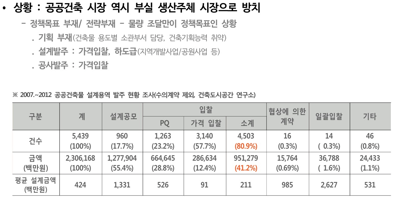 물량을 얼마나 조달할지만이 정책목표일뿐 공공건축 생활SOC의 퀄리티에 대한 고민이 없다. 모든 건축물이 용도별 소관부서에서 각자 알아서 설계발주하고 짓게 되어 있어 설계기획이나 발주에 대해 경험이 없는 공무원들이 알아서 발주하고 있다. 건축도시공간연구소에 따르면 공공건축물의 설계용역 81%가 가격으로 입찰되고 있다. 설계가 단순노동으로 취급받고 있다는 것이다.