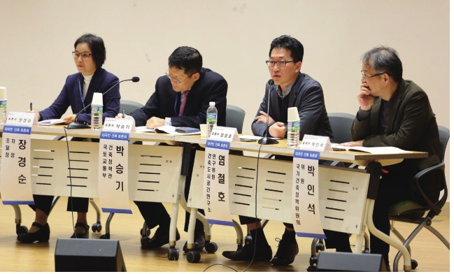 이어진 세션에서는 강미선 국가건축정책위원회 위원(이화여자대학교 건축학과 교수)의 주재로 ▲ 박승기 국토교통부 건축정책관 ▲ 이경석 국토교통부 건축문화경관과장 ▲ 장경순 조달청 차장 ▲ 염철호 연구위원(건축도시공간연구소) ▲ 기노채 하우징쿱 협동조합 대표 ▲ 노영자 건축사(건축사사무소 엘아이엠) ▲ 박성기 건축사(주.세이브 종합건축사사무소) ▲ 임정택 건축사(주.제이플러스 종합건축사사무소)가 토론을 가졌다.