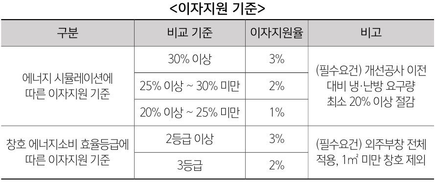 대출이자 지원 기준은 비주거와 단독주택의 경우, 시뮬레이션을 거쳐 그린리모델링 개선 전·후의 에너지 절감효과를 분석한 결과에 따라 다르게 적용된다. 공동주택의 경우에는 창호에너지소비효율등급에 따라 창호만 교체할 시에도 2~3%의 이자를 지원받을 수 있다.
