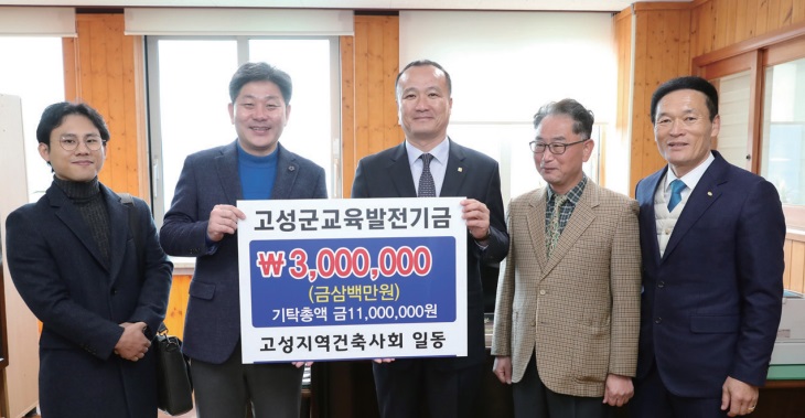 고성지역건축사회는 11월 23일 고성군청을 방문하여 교육발전기금으로 300만원을 기탁했다. 전달된 교육발전기금은 고성군 지역의 교육발전과 학생들의 꿈을 펼칠 수 있는 교육환경 조성 장학금으로 쓰일 예정이다. 고성지역건축사회는 지난 2013년부터 지역사회의 소외된 이웃에게 보탬을 주기위해 기탁을 이어오고 있다.