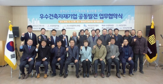 충청남도 우수 건축문화 활성화를 위해 충청남도건축사회가 12월 13일 ’우수건축자재기업 공동발전 업무협약식을 가졌다. 협약은 (주)경원알미늄, (주)스타빌엔지니어링 등 10개 우수건축자재기업과 맺었으며 건축사회와 협약 업체는 상호 발전을 위해 함께 노력할 예정이다.