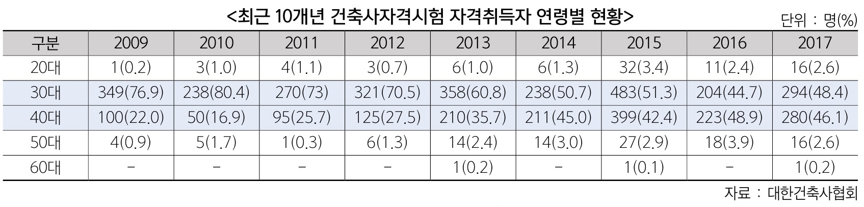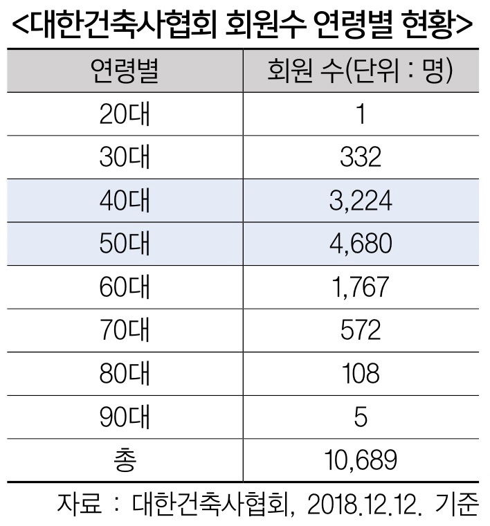 건축사자격시험 합격자 대부분을 차지하는 30, 40대의 대한건축사협회 가입률이 저조한 것으로 나타났다. 건축사자격시험 통계 현황에 따르면, 매년 30, 40대 합격자 비율은 90%를 훌쩍 넘는다. 2017년도 건축사자격시험 합격자 607명 중 30대가 294명(48.4%)으로 가장 높게 나타났으며, 40대가 280명(46.1%)으로 30, 40대 합격자 비율이 94.5%에 육박했다. 반면 이듬해 건축사협회에 가입한 30대 건축사는 112명으로 집계됐다. 30대 합격자의 3명 중 1명만 협회에 가입한 셈이다.