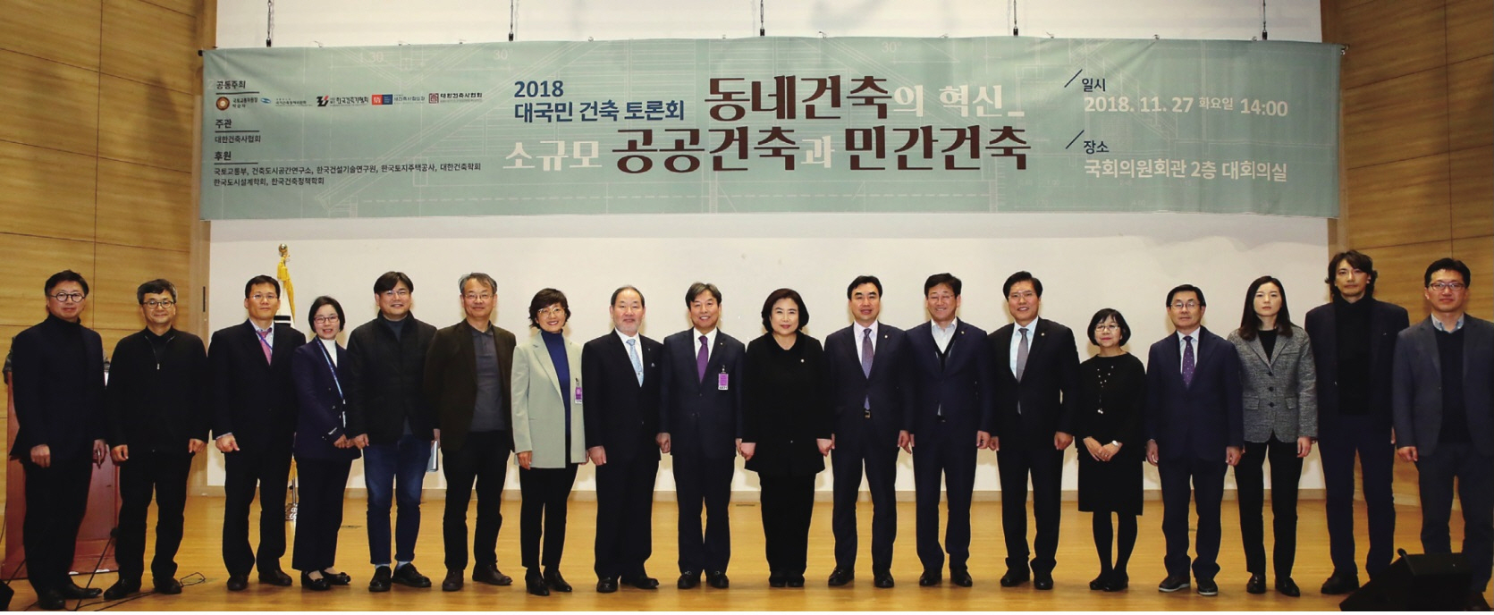 소규모 건축물을 개선하기 위한 대국민 토론회도 개최됐다. 국회 국토교통위원장과 국가건축정책위원회, 한국건축가협회, 새건축사협의회, 대한건축사협회가 공동주최하고, 대한건축사협회가 주관한 11월 27일 ‘2018 대국민 건축 토론회’가 ‘동네건축의 혁신 _ 소규모 공공건축과 민간건축’이란 주제로 600여 명이 참석하며 성공리에 마무리됐다. 토론회에서 주제발표를 맡은 국가건축정책위원회 박인석 위원은 우리 국토를 덮고 있는 건축물의 93%를 동네건축이 차지한다며 건강한 설계, 시공 주체가 정상적인 활동을 할 수 있도록 소규모 공공건축과 민간건축으로 나누어 정책전략의 재접근을 제시했다. 이어진 토론회에서는 소규모 공공건축과 민간건축으로 나누어 공공건축물 발주시스템, 설계공모 문제, 설계의도 구현, 건축사의 건축단체 의무가입, 건축지도 플랫폼 구축 등 여러 문제점과 대안들이 논의되며 건축정책 혁신이 필요하다고 강조됐다.