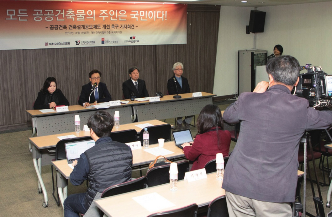 이에 대한건축사협회, 한국건축가협회, 새건축사협의회, 한국여성건축가협회가 한 목소리로 공공건축 건축설계공모제도 개선을 촉구했다. 건축4단체는 11월 16일 건축사회관 3층 국제회의실에서 기자회견을 열고 “모든 공공건축물의 주인은 국민이다. 건축설계공모 심사의 역할이 제대로 발휘될 수 있는 정책·제도·시스템이 투명하게 작동되도록 개선을 촉구한다”는 성명서를 발표했다. 이날 기자회견에는 KBS, MBC, JTBC, 조선일보, 중앙일보, 한겨레 등 여러 언론사가 참석했다.