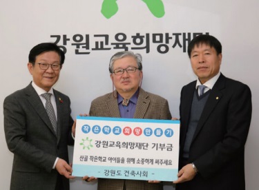 강원도건축사회는 2018년 12월 27일 강원교육희망재단을 방문해 산골 작은학교 아이들을 위한 기부금 200만원을 전달했다. 이 밖에도 강원도건축사회는 12월 13일 춘천MBC에 ‘2018 사랑의 쌀나누기’ 기부금을 전했으며, 12월 21일 강원일보가 춘천문화예술회관에서 개최한 ‘아름다운 동행’ 자선음악회에서도 기부금 100만원을 전달했다.