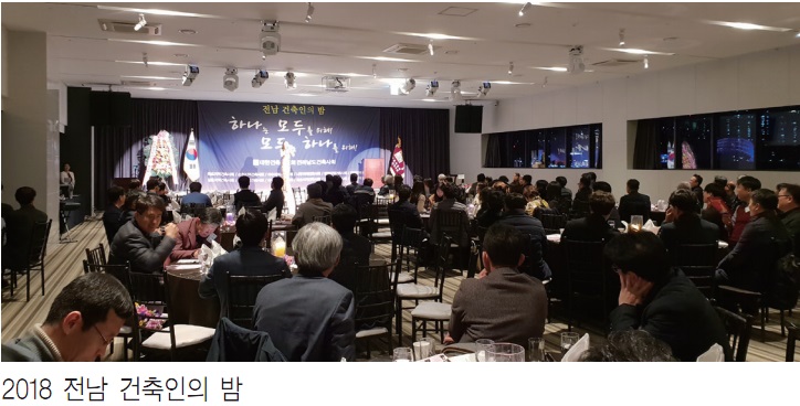 2018 전남건축인의 밤 및 건축사윤리교육이 지난 12월 14일 저녁 여수 베네치아호텔에서 열렸다. 이날 행사는 빈도림(디르크 휜들링) 전 독일연방 외무부 주한독일 대사관 서기관의 윤리교육과 퓨전국악공연, 기념식, 축하공연 등으로 진행됐다. 전라북도건축사회는 건축인의 밤을 통해 2019년 힘찬 출발을 다짐했다.