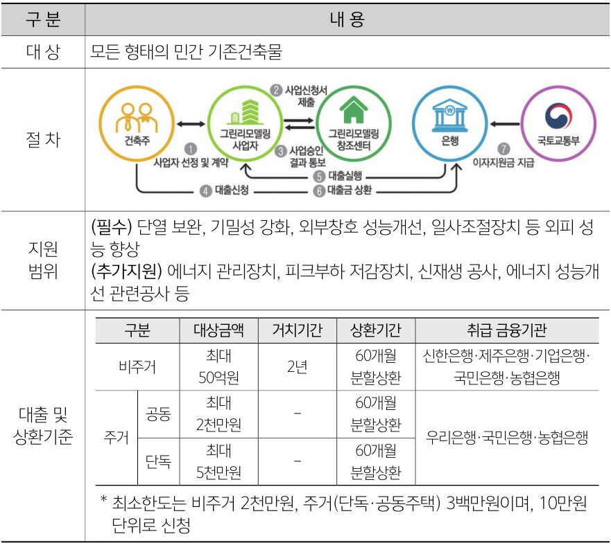 올해는 ▶ 단독주택용 간소화된 에너지 시뮬레이션 도입 ▶ 소액·간편 결제서비스 도입 ▶ 신용카드 연계 이자지원을 시행해 최소 대출금액을 대폭 낮췄다. 또 에너지성능개선 효과는 크지만 비용부담이 큰 복합시공을 활성화하기 위해 비주거건축물에 대해서는 2년의 거치기간을 신규로 도입했다.