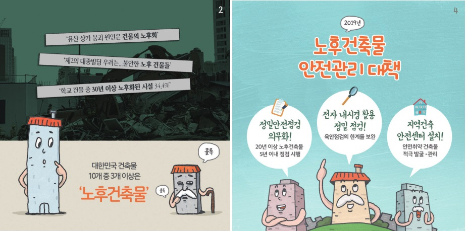 이낙연 국무총리는 “2017년 기준 전국 건축물 712만동 가운데 30년 이상 노후건축물이 37%다. 이중 정기점검을 받는 건축물은 3%에도 미치지 못한다”며 “노후건축물 안전관리가 시급해졌다”고 전했다. 이어 “저성장기, 인구감소기에는 도시행정과 건축행정도 달라져야 하며, 도시재생과 노후건축물 안전을 추진하는 것만으로는 충분하지 않다. 시대의 변화를 행정의 틀과 사고방식에도 반영해야 한다”고 덧붙였다.