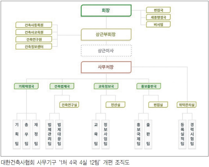 대한건축사협회는 사무기구를 기존 ‘1처 2국 9실 13팀’에서 ‘1처 4국 4실 12팀’으로 2월 1일 일부 개편했다.