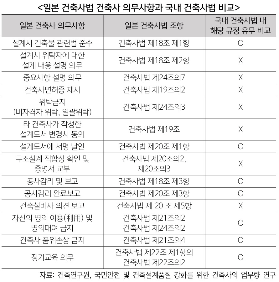 일본의 경우, 일본 건축사법으로 정하는 건축사의 의무사항은 법령 또는 조례가 정하는 기준에 적합하도록 설계하는 것을 기본으로 총 14가지이다. 우리나라와 달리, 설명의무, 건축사 면허증 제시, 위탁금지 규정이 있다.
