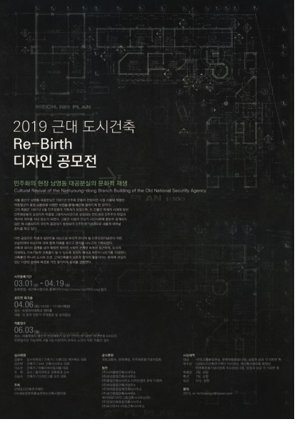 자세한 내용은 '2019 근대도시건축 Re-birth 디자인 공모전 사무국' 공식 이메일(2019_re-birthdesign@naver.com)로 문의하면 된다.