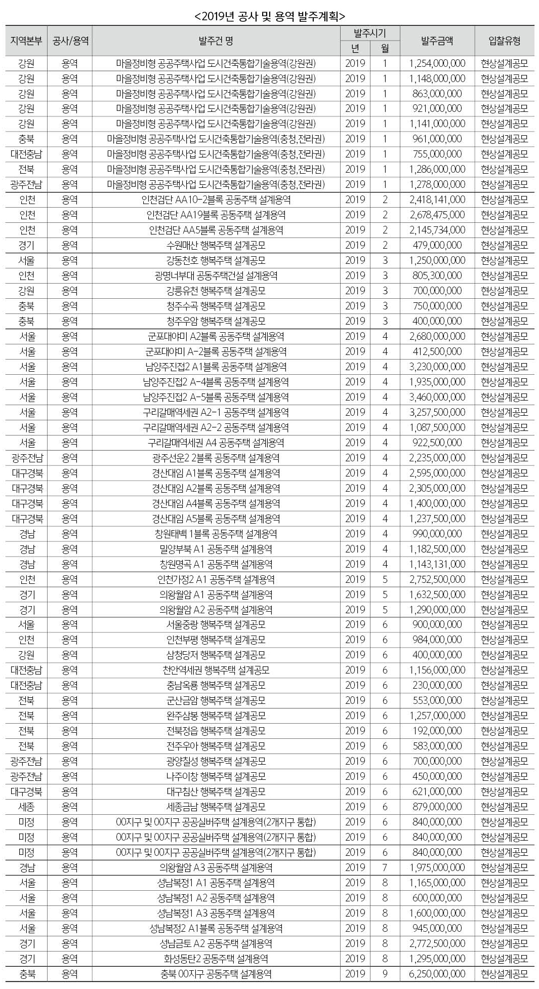 LH의 ‘2019년 공사 및 용역 발주계획’에 따르면 올해 설계공모 용역은 공동주택이 31건으로 가장 많으며, ▲ 행복주택(18건) ▲ 공공실버주택(3건) ▲ 도시건축통합기술용역(9건)이 그 뒤를 이었다.