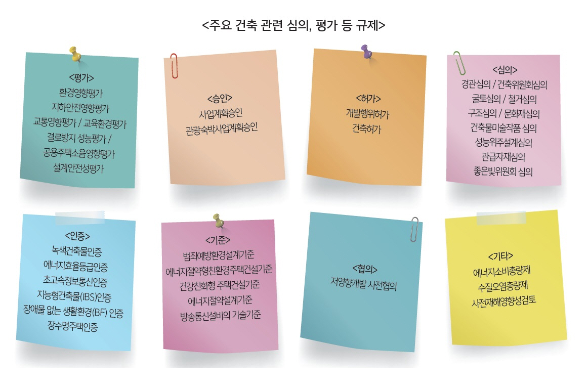 사건사고나 이슈가 발생할 때마다 안전 강화를 앞세워 건축 관련 인증, 심의제도가 중구난방 생겨나고 있다. 복잡한 심의 인증에서 발생하는 비용과 심의위원 한명의 주관적 판단으로 발생하는 무기한 허가 연장이 국민의 재산권에 큰 손실을 주고 있다. 국민의 불편과 사회적 비용을 줄이면서 효율성을 높이기 위해 기관별 중복심의를 막고, 관계 공무원과 심의위원회의 전문성을 높이는 등 건축심의제도를 개선해야 한다는 지적이 지속적으로 제기됐다.